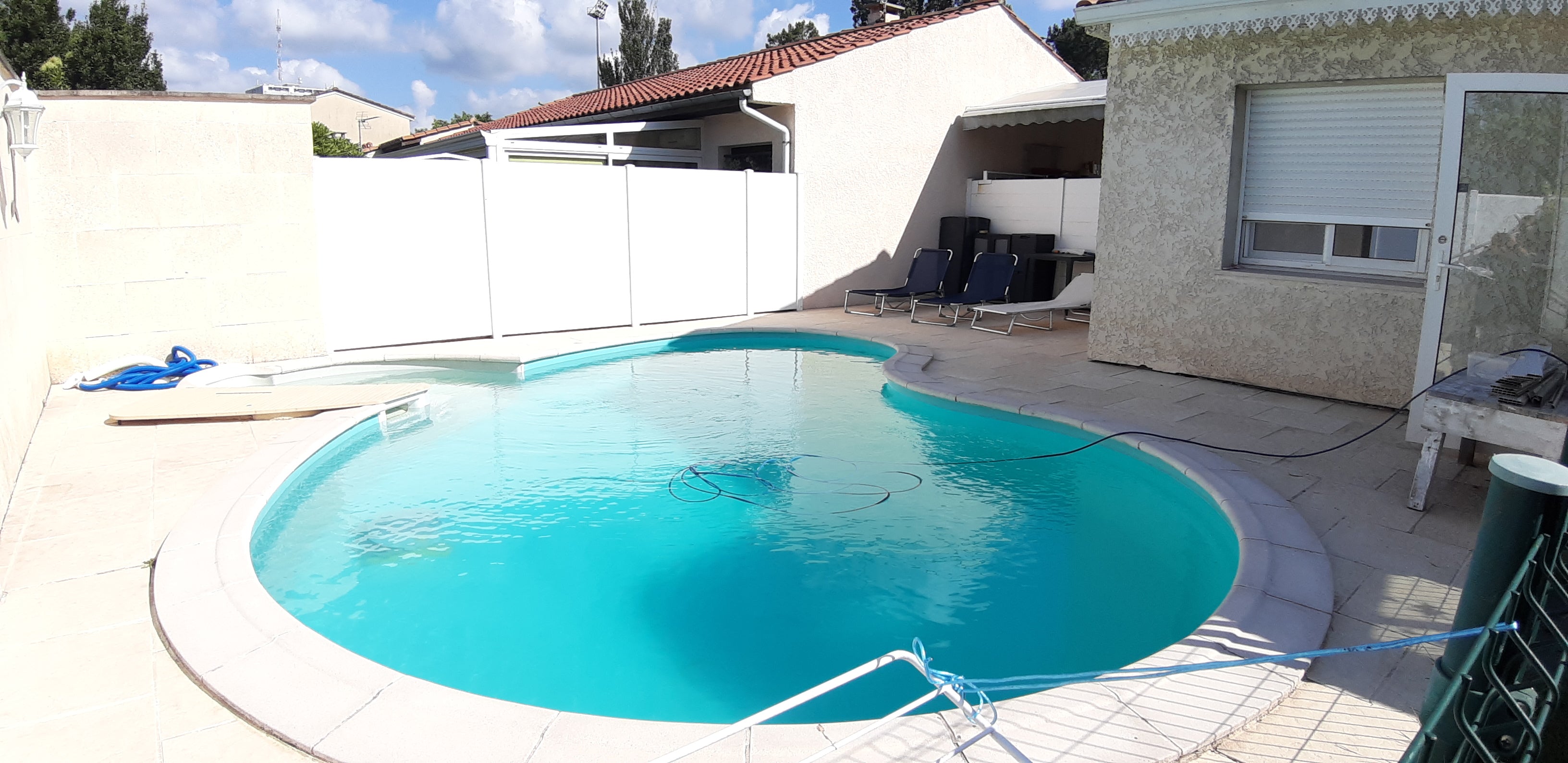 Au milieu d'un lotissement très calme, maison RDC + 1 étage, jardin, véranda et piscine.