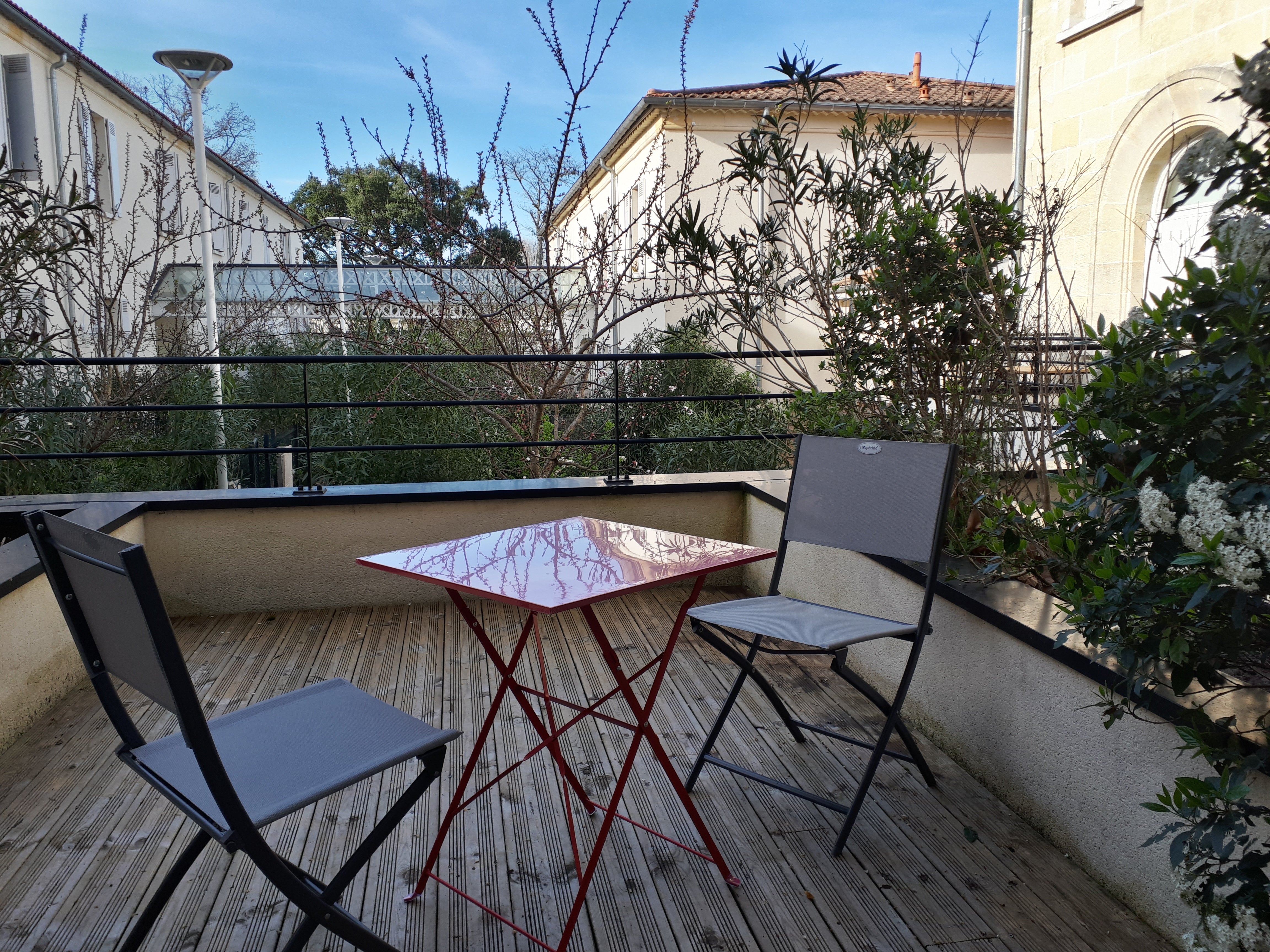 Grand T2 duplex neuf, très calme, confortable, Résidence sécurisée avec interphone, dans bâtiment classé (couvent 18ème siècle rénové en 2015) Proche toutes commodités (Bus Tram, Commerces, Facultés, Hôpitaux Bagatelle et Piquet, Inra, Kedge). Centre Bordeaux à 15mn parTram direct ou bus. Gare de Bordeaux 15 mnTram C. Aéroport Mérignac 15mn par rocade. Très calme et lumineux. Terrasse privative. Parking privé numéroté. Décoration intérieure contemporaine (mobilier neuf).