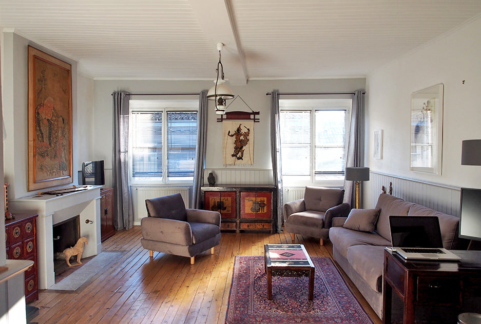 Le salon est décoré avec une grande tenture chinoise, une marionnette cambodgienne sur lin, trois meubles chinois avec chaîne hi-fi et cd, deux grandes peintures originales, un dessin, deux têtes de bouddha en pierre et bronze, une sculpture de cheval en pierre, un miroir ancien, un tapis, une table b Bordeaux, France Hypercentre, lumineux 80 m2, clim & parking Entire rental unit vacation rental best price 53821169