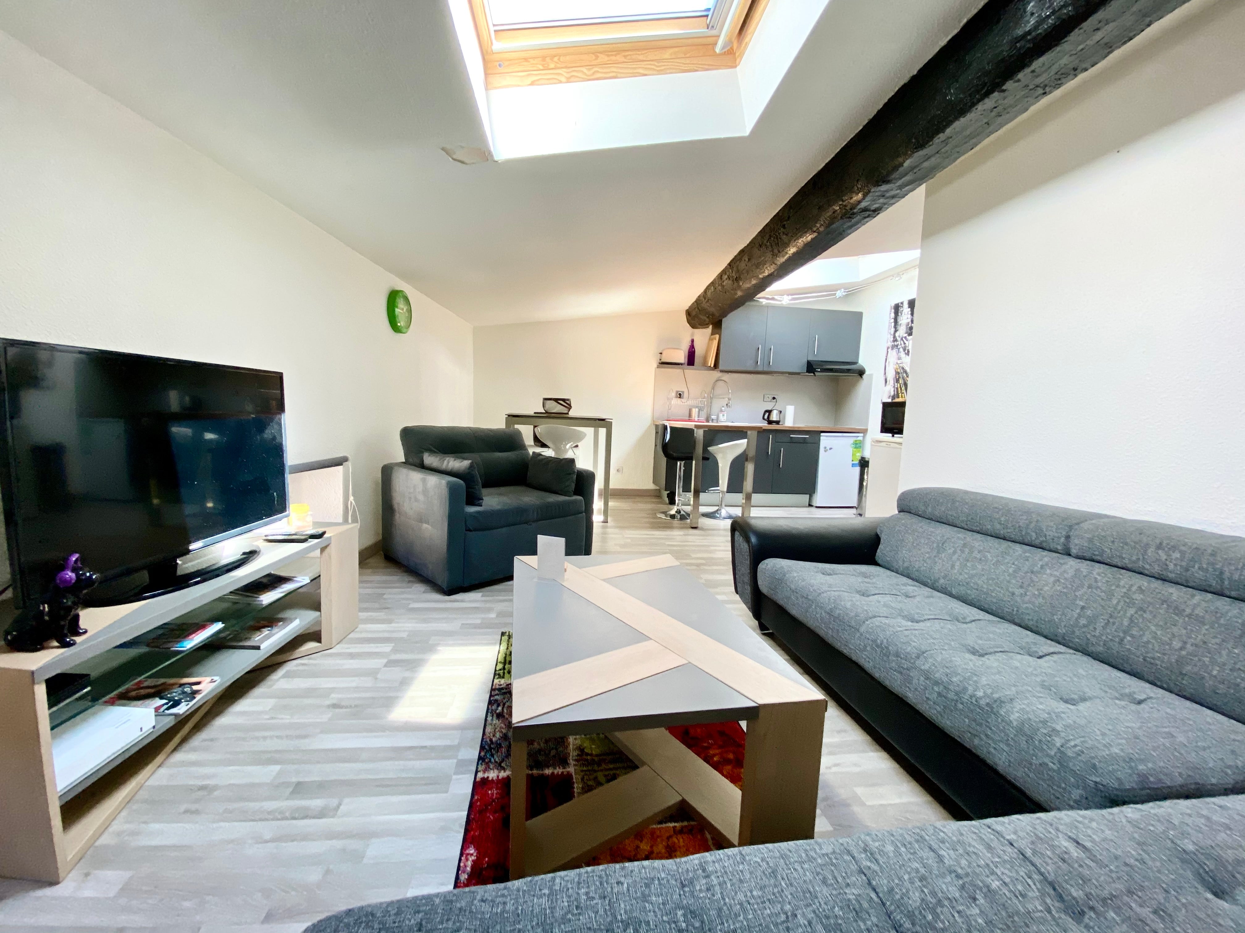 NEWLY LISTED This quiet and comfortable apartment, renovated in 2016, offers: - a living room with corner sofa, flat screen TV, wifi internet connection, coffee table, high table - an open kitchen, integrated and with all the comfort required: fridge, freezer, microwave, hotplates, kettle, friendly bar with highchairs - one bedroom, with wardrobe and large bed - a bathroom with washbasin, bathtub, heated towel rail, washing machine -dryer and toilet, iron and ironing board.