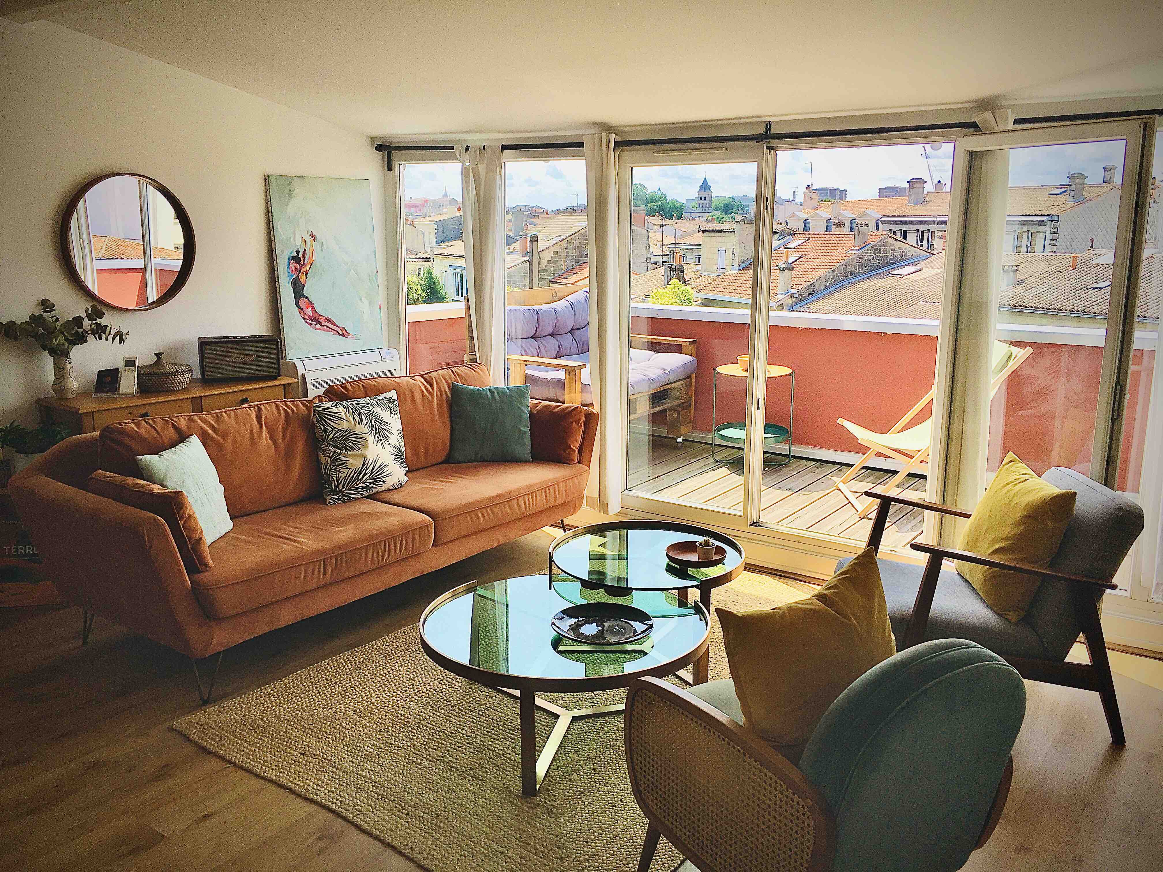 Profitez d’un appartement tout équipé, proposant une vue imprenable sur les toits et les clochers de Bordeaux, au calme le salon côté jardin vous permettra de vous relaxer sur la terrasse.