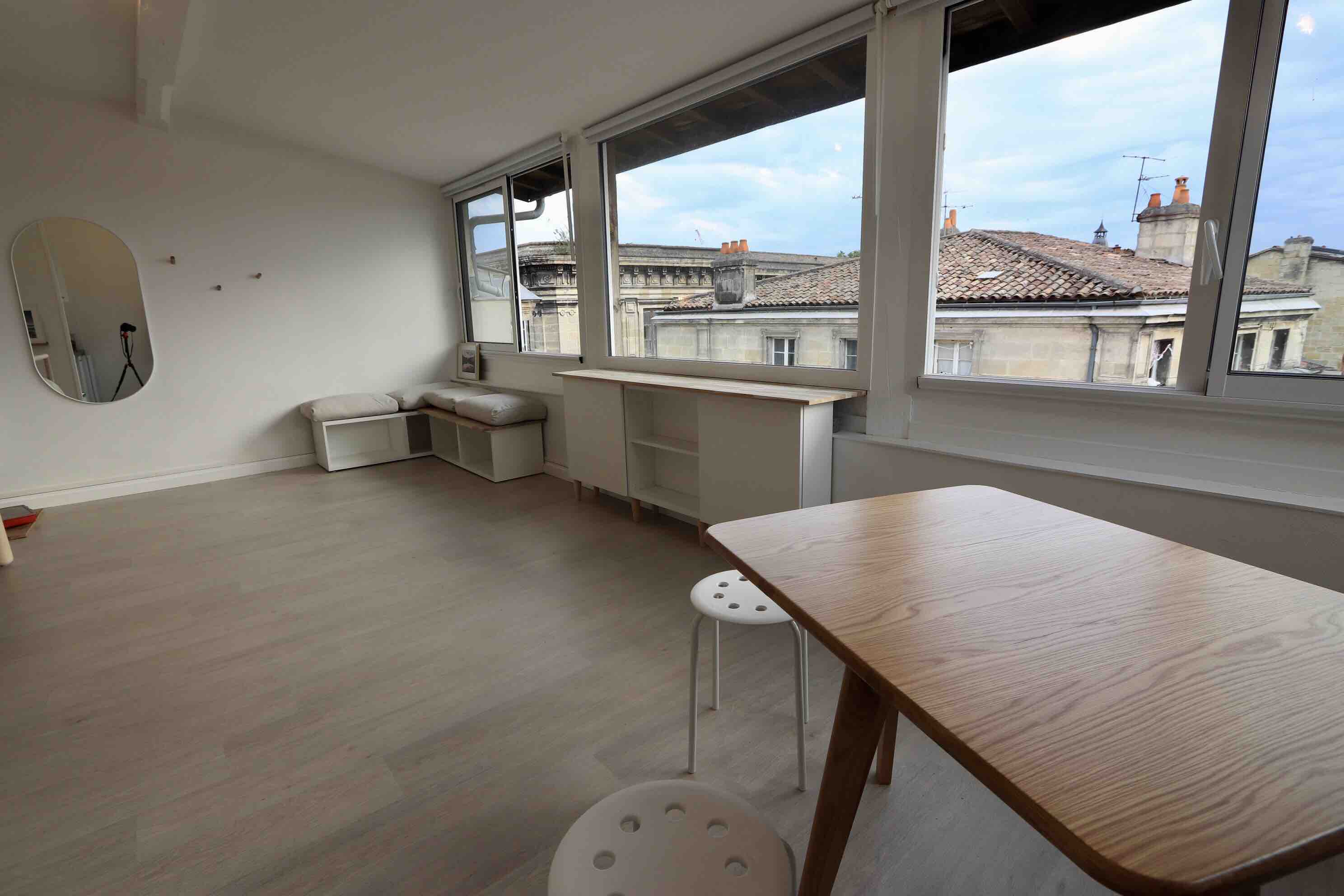 Le studio est situé au 3ème étage d'un petit immeuble dans le centre de Bordeaux. Il est composé d'une grande pièce principale avec une cuisine ouverte et une série de grande fenêtre qui apporte une belle luminosité ainsi qu'une vue dégagée. L'appartement est entièrement équipé avec tout le nécessaire pour cuisiner, une machine à laver le linge, une baignoire…