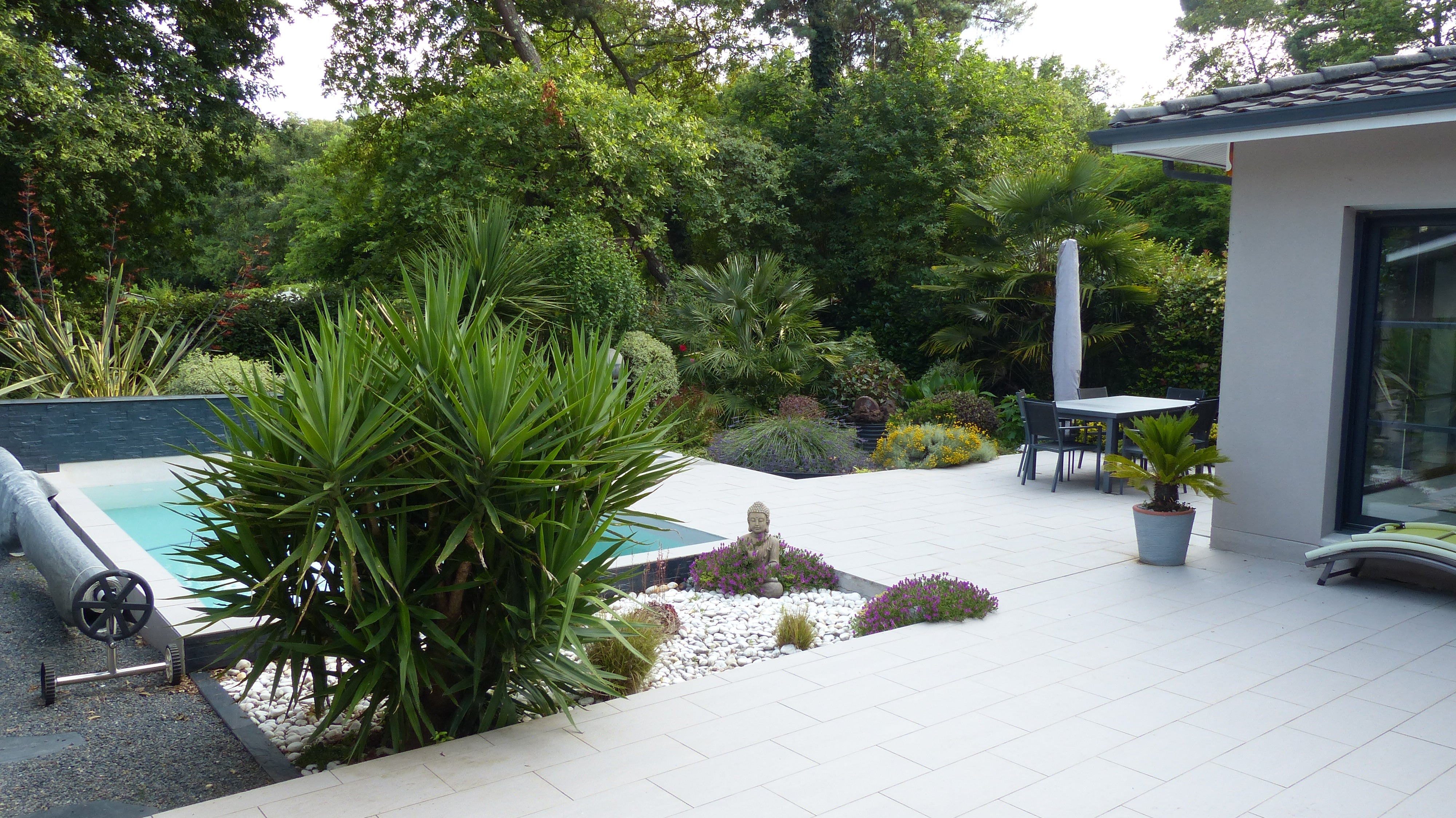 Jardin haut de gamme avec ambiance zen et champêtre.