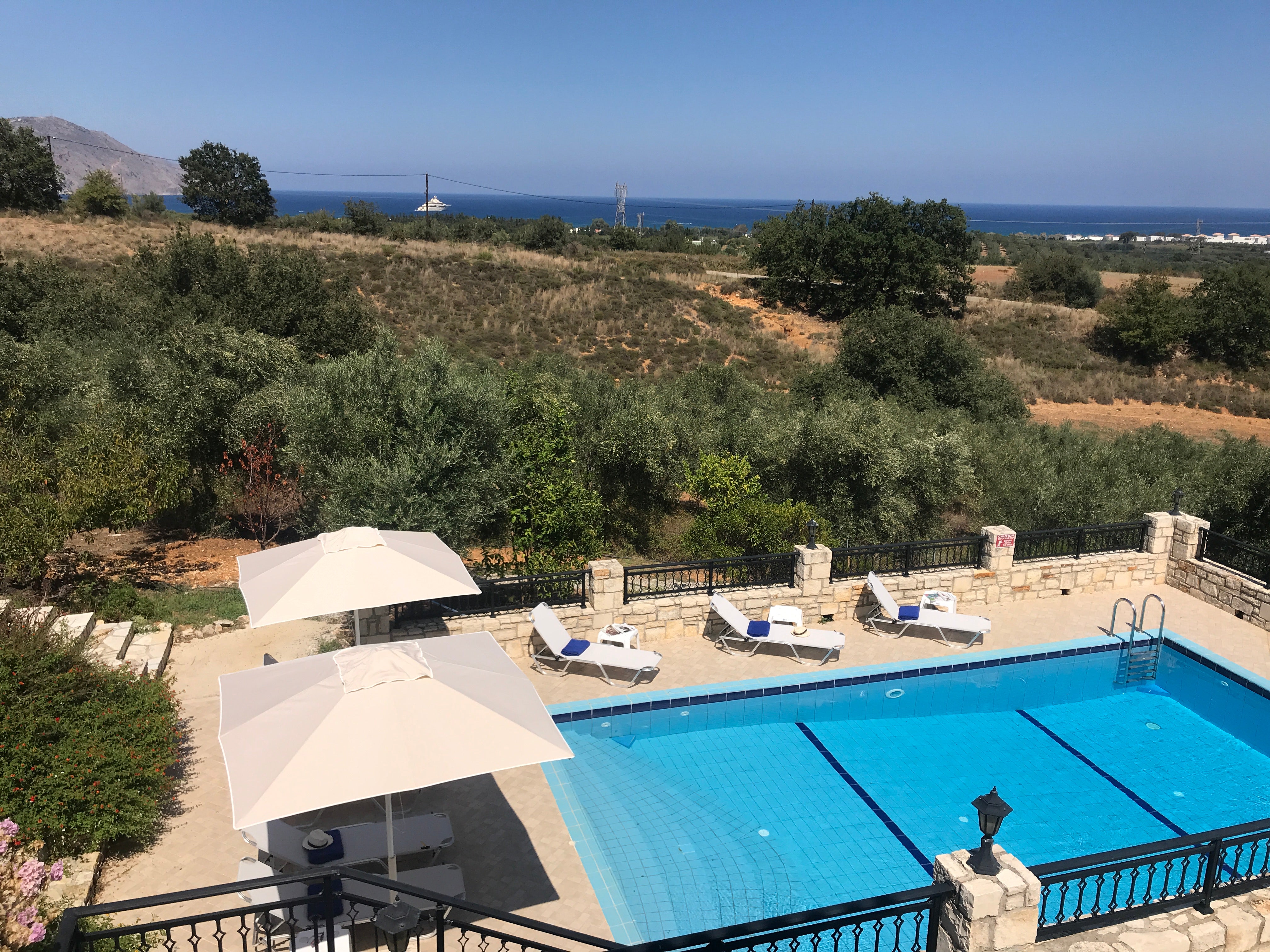 Cette magnifique Villa est située à quelques minutes en voiture du village de Georgioupolis et de ses belles plages de sable blanc. Son emplacement en pleine nature vous offrira des vacances au calme, loin de l'agitation touristique. Depuis la piscine, terrasses, salon, chambres, vous avez une splendide vue sur la baie de Georgioupolis. Avec ses 5 chambres, elle peut accueillir 11 personnes, et il y a également dans le salon 2 couchages prévus, très bonne literie sur mesure. Pool-house, BBQ