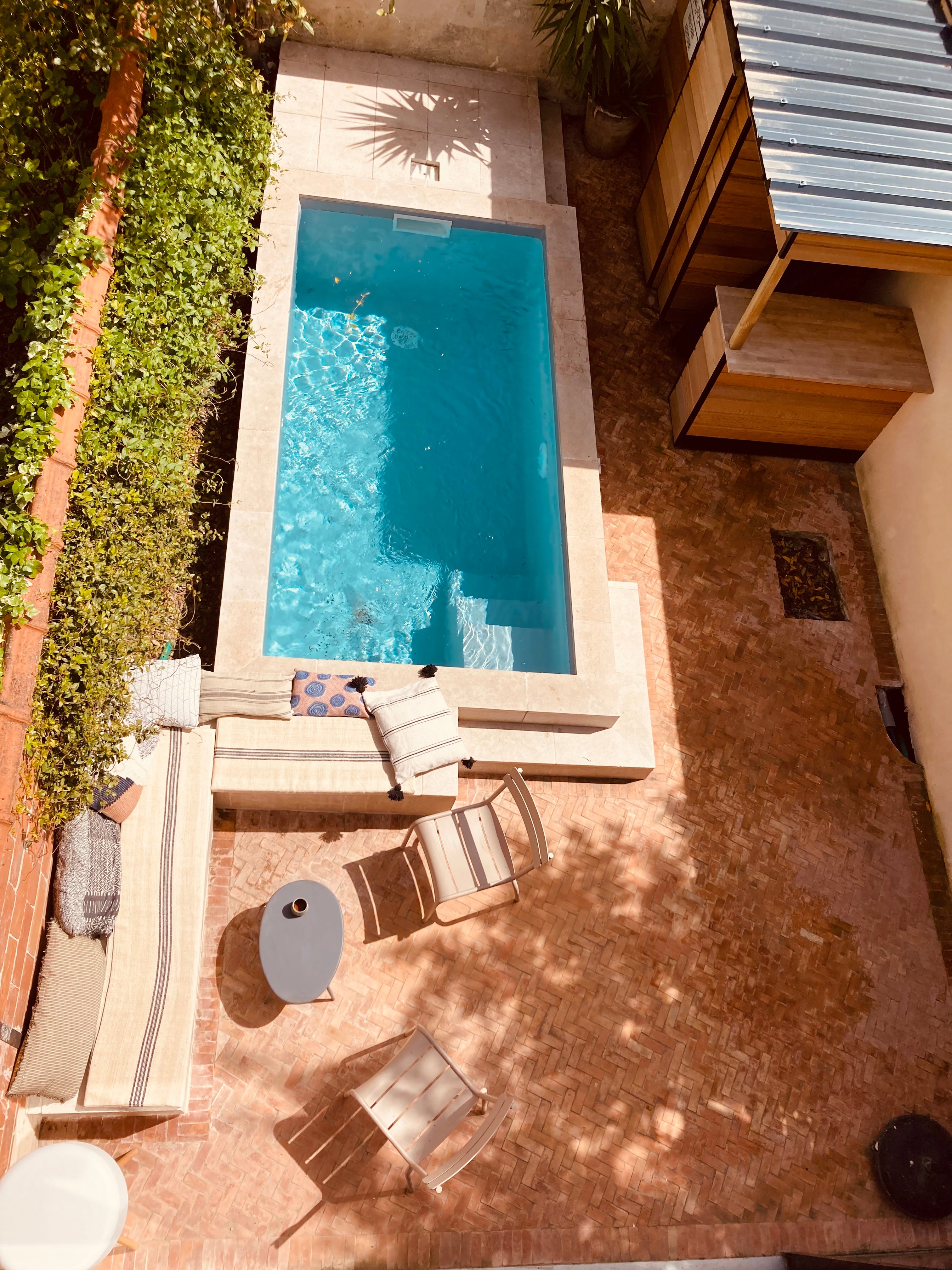 Une grande pièce à vivre au RDC : cuisine, salon, salle à manger qui donne sur l'extérieur avec piscine.