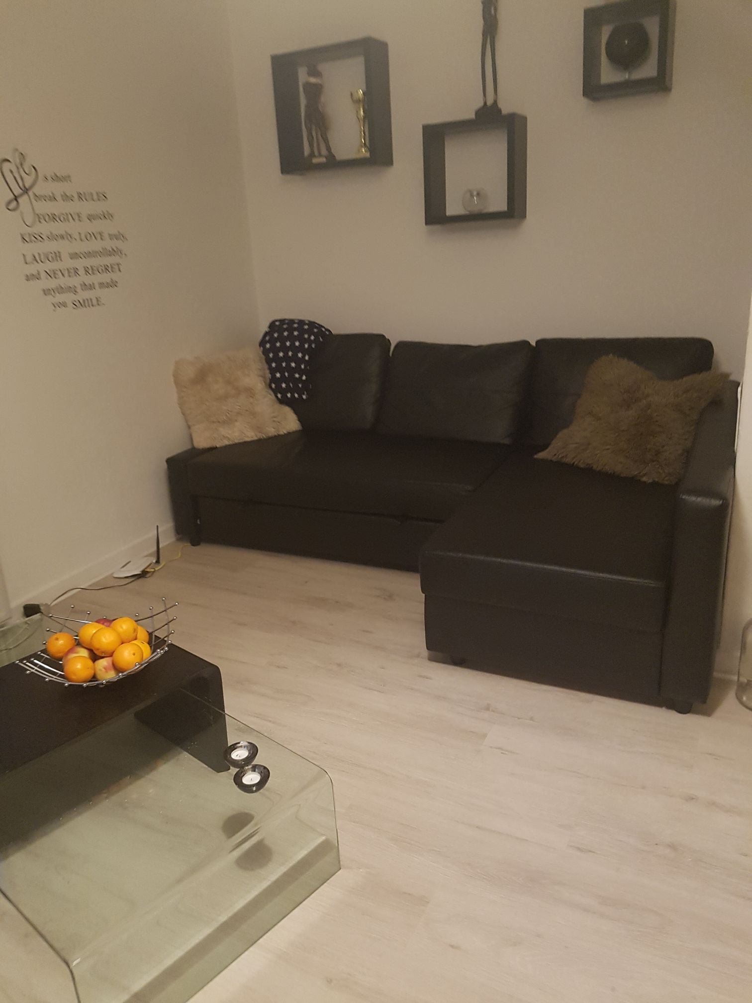 Lejligheden var 2 værelse og en stor stue. I stuen er der mulighed for slå sofaen ud til en dobbeltseng.
