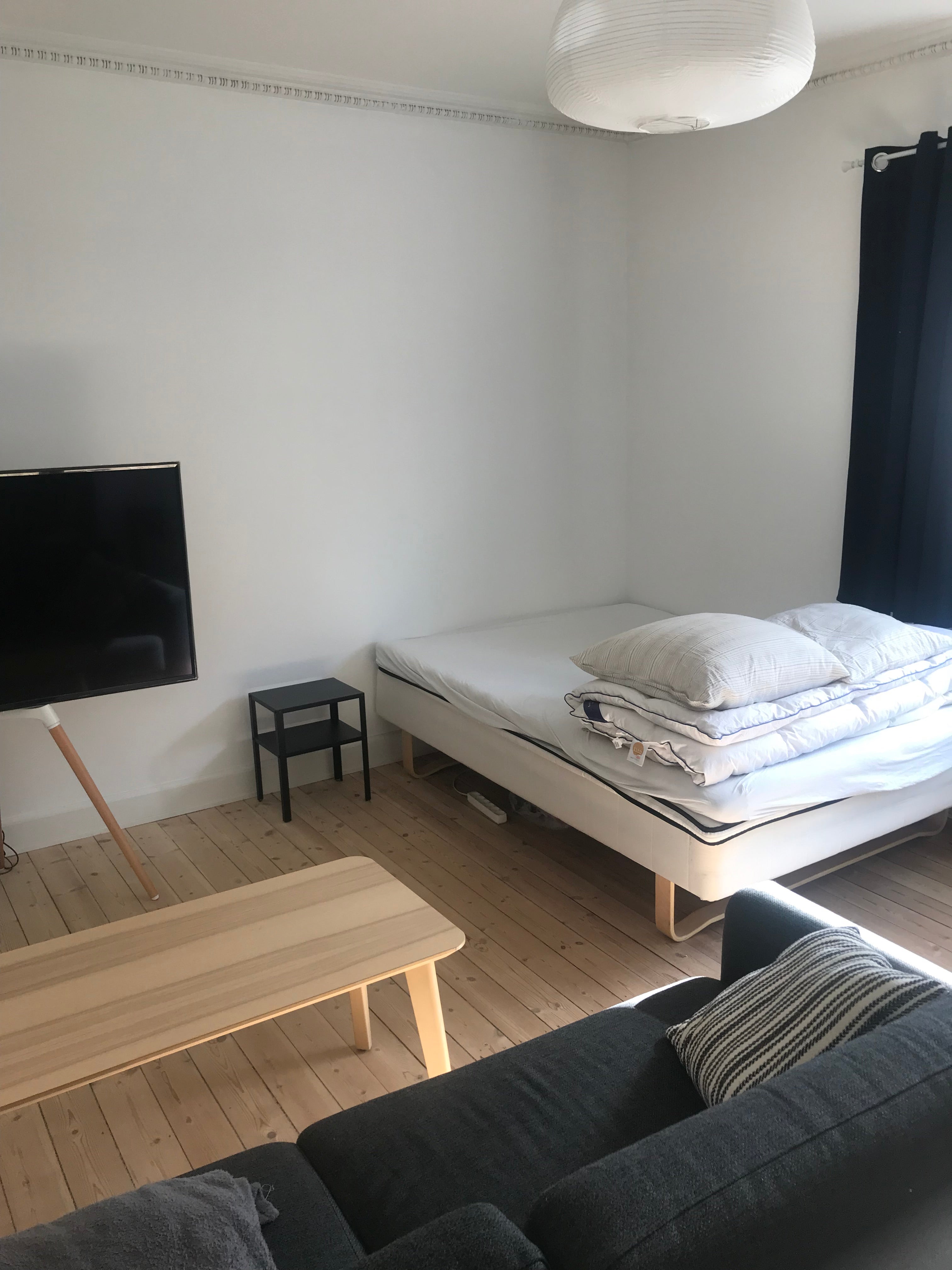 Livingroom with a double sized bed, and a nice 3-persons couch.
